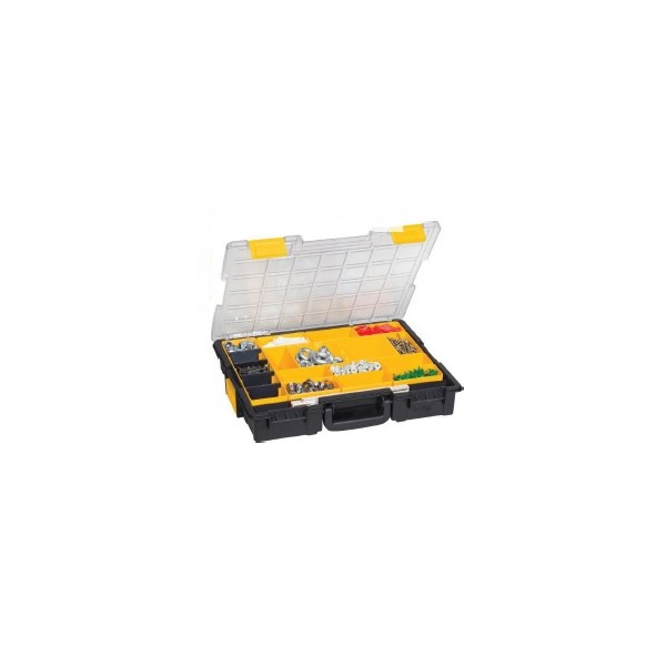 21 bacs de rangement modulables. Malettes empilables et clipsables entre elles. Couvercle en polycarbonate resistant aux chocs. Poignée ergonomique et rabattable. Dimensions : 440x355x76 mm.