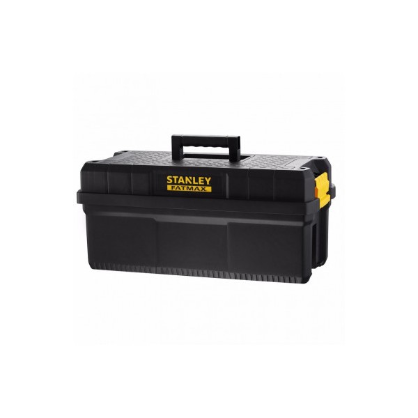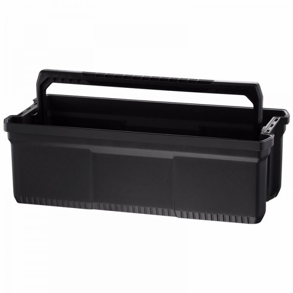 Une boîte à outils de 63 cm avec un marchepied d'une hauteur de 45 cm intégré dans le couvercle. La boîte se transforme en panier avec poignée rabattable sur le dessus et prises latérales. Elle se fixe sur le marchepied à l'aide d'une double attache qui fixe également le couvercle sur la boîte. Marchepied avec poignée ergonomique renforcée, marche en plastique et métal, pieds en aluminium et anti-dérapants avec boutons de blocage pour les sécuriser en position ouverte.